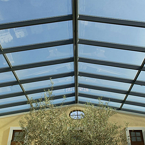 В основе светопрозрачных кровель - легкий и прочный алюминиевый профиль. В данной конструкции используем только однокамерные стеклопакеты, поскольку они обладают меньшим весом. Для безопасной эксплуатации и защиты от механических повреждений в остеклении устанавливаются ударопрочные стекла двух видов: закаленное и триплекс.